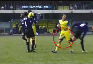 在本輪結(jié)束的國米與切沃的比賽中,盧西奧使出了一招“蝎子擺尾”,但是目標卻是對手的襠部。