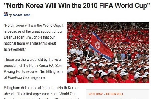 在此前的熱身賽中球隊2-2戰(zhàn)平前歐洲冠軍希臘,這場平局極大刺激了朝鮮人的信心。在談到為何認為球隊能夠奪冠時,孫光浩態(tài)度十分堅定:“本屆世界杯朝鮮將會奪冠,因為我們有親愛的領(lǐng)袖金正日的巨大支持。這將會帶領(lǐng)我們達到最后的目標!”