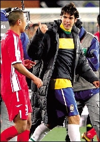 賽前大屏幕用視頻方式公布各隊(duì)首發(fā)名單,卡卡出現(xiàn)時(shí),引發(fā)了全場(chǎng)最響亮掌聲和尖叫聲。當(dāng)卡卡踏上球場(chǎng),球迷的呼喊聲也是最大的。但比賽中的卡卡讓球迷失望了。卡卡每次拿球身邊總會(huì)有3名球員包夾。帶球被搶斷、傳球不到位、多次被撞翻,甚至帶球急停時(shí)摔跤。很顯然,卡卡的身體狀態(tài)非常糟糕。第80分鐘,卡卡被換下。賽后,心煩的卡卡甚至拒絕了鄭大世交換球衣的要求。