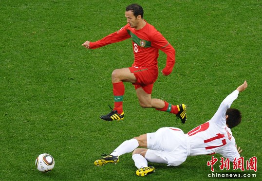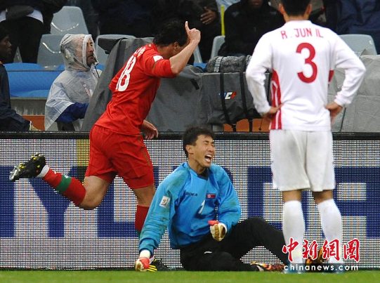 比賽在雨中進行,當年對陣朝鮮連下四城的尤西比奧到場觀戰。葡萄牙隊在演奏國歌時臂纏黑紗,悼念上周五去世的諾貝爾文學獎獲得者若澤-薩拉馬戈。開場3分鐘,C羅中路突破距門21米處左腳抽射蹭樸哲鎮身體被李明國沒收。第4分鐘,梅雷萊斯左路傳中連碰兩名后衛折射到卡瓦略腳下,卡瓦略在門前12米處轉身右腳抽射高出。