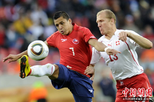 中新網6月21日電 北京時間今晚,世界杯H組第2輪首戰在伊麗莎白港納爾遜-曼德拉灣球場展開較量。瑞士中場貝赫拉米連續肘擊兩人,被紅牌罰下后,以十人應戰的他們在下半場被智利隊岡薩雷斯打入一球,以0-1告負。