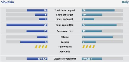 因為斯洛伐克進行緊逼防守,與意大利隊肉搏,因此場上對抗激烈,斯洛伐克隊20次犯規,而意大利隊也有17次法規。黃牌方面,兩隊可吃到四張,場上局面可謂是火星四射。