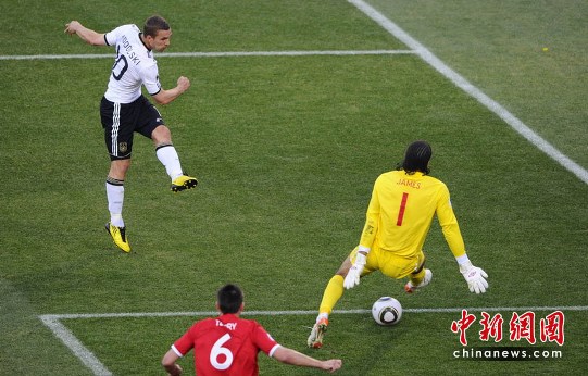 事實證明,比賽從開場哨音響起的那一刻就注定了這將是一場史詩般的對決。生死冤家在稍微試探之后開始對攻大戰,擁有鋼鐵意志的日耳曼戰車以簡潔高效的打法率先發難。第20分鐘,門將諾伊爾大腳將球開至前場,克洛澤擠住英格蘭防守隊員面對出擊的門將詹姆斯右腳冷靜捅射破門,這是克洛澤第99次代表國家隊出賽打入的個人第50粒入球。