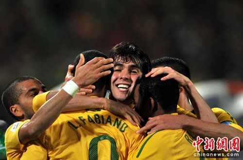 中新網(wǎng)6月29日電 今天凌晨2:30,南非世界杯1/8決賽再戰(zhàn)一場。奪冠熱門巴西隊在約翰內(nèi)斯埃利斯公園球場迎來了南美兄弟智利隊。最終憑借胡安和法比亞諾的在上半場的進球、羅比尼奧下半場錦上添花,巴西隊以3-0淘汰智利,晉級八強。