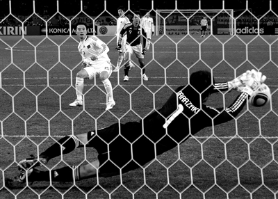 易邊再戰,日本隊加強進攻,一度占據優勢。第54分鐘,內田篤人禁區內右側勁射,皮球擊中立柱后彈在楊智手里。1分鐘后,榮昊左側下底快速傳中,在中國隊搶點壓力下,中澤佑二飛身救險和門將酋崎正剛彼此干擾,皮球反彈向空門,田中斗笠王在門線前解圍。第81分鐘,姜寧左路形成傳中,日本隊球員禁區內手球犯規,可惜楊昊打出力道不大的半高球,被酋崎正剛將點球撲出。最終在凜冽的寒風中,雙方0比0戰成平手。整場比賽,國足打出了久違的精氣神,多次贏得現場中國球迷掌聲。