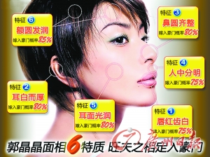 一則女性論壇調查顯示,有超過四成的網友欲效仿郭晶晶的面相進行整容,原因主要有兩方面。第一,奧運冠軍郭晶晶業已成為萬千男女的偶像,整成一張冠軍臉,可以讓自己更加有氣質;第二個也是最重要的原因,多數網友留言顯示,郭晶晶的面相是百年難遇的旺夫相,這也正是霍家公子不惜一切代價追求郭晶晶并堅決不放棄的原因之一,能夠擁有這樣的旺夫相,可以讓自己在選擇夫婿的時候擁有更多的選擇。