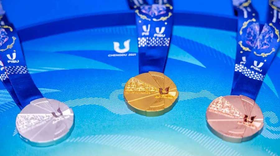 獎牌形態呈現出不規則的圓形,以致敬太陽與青春;獎牌會徽面特設“文明時光墻”,刻畫了從象形文字“蜀”到現代漢字“雄起”等不同時期的中國文字