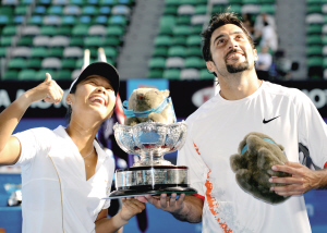 在2008澳網最后的決戰日,中國金花孫甜甜幸運地舉起了冠軍獎杯,她和塞爾維亞選手澤蒙季奇搭檔在混雙決賽中贏得了勝利。孫甜甜為中國女網贏得了第三座大滿貫冠軍獎杯,而澤蒙季奇則為塞爾維亞奪取了首個大滿貫冠軍。