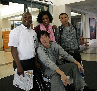 沒了拐杖的劉翔自然不會一蹦一跳地出現(xiàn),5分鐘之后,一身灰色運動服的劉翔也出現(xiàn)在了醫(yī)院門口。依然是那個搞怪的劉翔,只是身下的輪椅有些讓他不習慣。就連“飛人”自己都覺得坐在輪椅上有點丟臉,一看到鏡頭就用手遮住臉,只露出一只眼睛來,沖著鏡頭直笑。