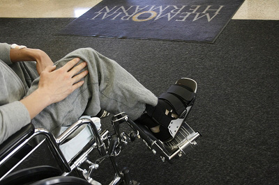 或許是在安靜的醫(yī)院待久了,好動的劉翔一出赫曼紀念醫(yī)院就沖著所有人做起了鬼臉,那個熟悉的劉翔又回來了。不過劉翔的這次亮相有點不同:“飛人”暫時棲息在輪椅上,右腳還包裹著厚厚的紗布,外面再加上一個高至膝蓋下方的護具。