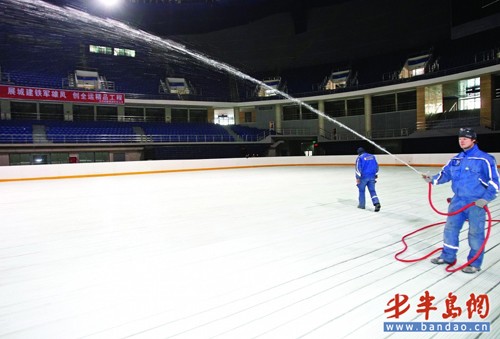 預計兩天時間,專家就可為1800平方米的賽場鋪上一層大約4厘米厚的冰面,為4月份將要在青島舉行的十一運花樣滑冰和短道速滑的比賽做好準備。