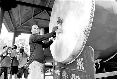 李仁港在鴻門宴遺址擂起“高祖鼓”。 張偉攝