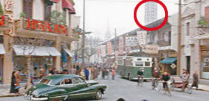 幕后:為了完整重現《色,戒》中30年代場景,李安不惜花了3000萬人民幣在上海搭建了一條完整的“南京西路”,道路兩旁盡是2、3層樓的建筑,共蓋了大小180家商店。據悉,原著小說中,曾出現店家的陳年照片,李安就根據這些,再對照真實史料,仔細考究搭建,就連櫥窗內的商品也以真品放置。李安對美工的要求幾乎到了苛刻的地步,連一只杯子都要和當年一模一樣。但百密一疏,背景中的高樓影子,本應該在后期制作中用電腦刪去,卻疏忽了。