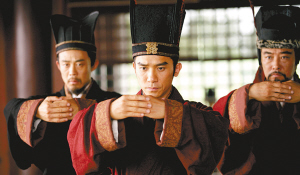 昨日,本報記者拿到一批《赤壁》官方劇照,從劇照上看無論是服裝還是化妝《赤壁》都秉承寫實風格,其中金城武扮演的諸葛亮右手握羽扇,左手竟然拿著一只小烏龜,不知這只小龜是否拿來占卜使用?而侯勇扮演的魯肅和連環畫的形象非常相似,應該會得到影迷的肯定。另據《赤壁》制片張家振透露,金城武所有戲份已全部拍攝完畢,即使在11月17日的火燒烏林橋段有金城武的戲份,也已經在10月4日前預先取鏡完畢,不會使用替身去補拍。