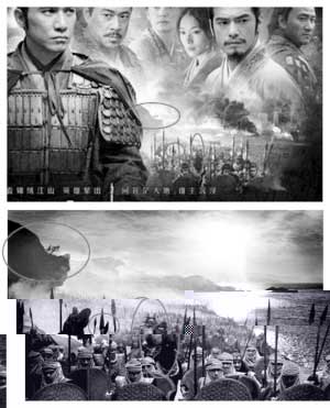 在這款《赤壁》內地版橫版海報上,片中主要角色周瑜、諸葛亮、小喬、孫尚香都在海報上各居其位,海報右下方看上去是影片中的某個場景:一班全副武裝的戰士沿江而行,不遠處狼煙滾滾。如果你在為這張海報的氣勢恢宏嘖嘖稱贊的時候,再把那張電影《300勇士》的海報放在一起比較,就會發現這張海報和《赤壁》的三處畫面“如出一轍”,除了戰士的裝束不同,背景略有差異,其他方面幾乎一模一樣。