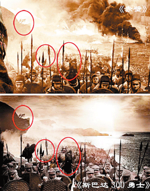 一張《赤壁》和《300勇士》的對比照昨日成為網(wǎng)友熱議的焦點。照片發(fā)布者圈出吳宇森新片《赤壁》官方海報中和《斯巴達300勇士》劇照的相似之處,并直指《赤壁》抄襲。對此中影營銷分公司負責人直斥“無聊炒作”,并稱“每款海報都有不同的風格。”