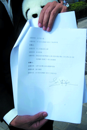 “我就不明白了,熊貓怎么會是綠色眼睛?夢工廠必須給我作出解釋!……”趙半狄頭頂熊貓,手拿起訴書,以及法院的受理號,理直氣壯地站在朝陽區人民法院的門口,和他的委托代理人站在一起,“咔嚓”了好幾張照片,都貼進了他的博客。