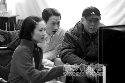 陳凱歌與章子怡、黎明在《梅蘭芳》拍攝現(xiàn)場。