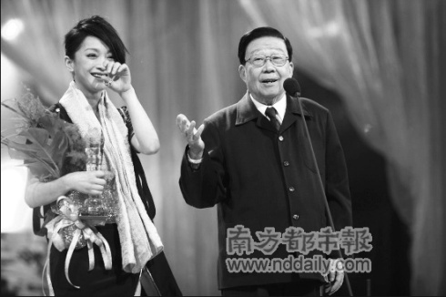 2008年度影視頒獎盛典7日晚揭曉,周迅的恩師謝鐵驪導演親自為她頒獎,讓周迅不禁激動落淚:“沒有謝導就沒有今天的我。”(見上圖)當宣布邀請謝鐵驪導演登臺頒獎時,原本在臺上的周迅立即沖下去,走到觀眾席親自攙扶謝導走上舞臺。18年前周迅在銀幕處女作《古墓荒齋》,正是出自謝鐵驪導演之手。此番再次會面,讓兩人都是感慨不已。