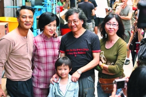 任達華、吳君如與導演羅啟銳(左二)及監制張婉婷合影,而前面的小演員是曾經在《大搜查》中演陳奕迅兒子的鐘紹圖。