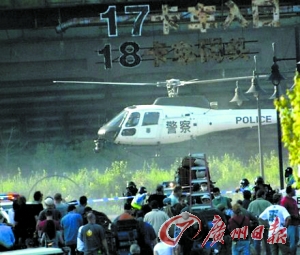 寫上簡體中文字的警用直升機參與拍攝的工作照。