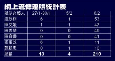 發(fā)放者先于昨日凌晨約1時(shí)30分傳出一張疑似顏穎思的淫照,直至昨午1時(shí)半,共210張淫照以zipfile(壓縮檔)形式經(jīng)電郵傳出,其中疑似鍾欣桐的照片最多,達(dá)53張(見(jiàn)表)。前晚開(kāi)始更陸續(xù)有網(wǎng)友聲稱看過(guò)一段約32分鐘有關(guān)陳冠希與一名女藝人的短片。