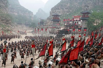 主戰的曹操隨即拉開了《赤壁》(上)中的第一場戰役——新野之戰。當用文字描繪的戰役變成影像,有所改變是自然的。所以,當張飛“當陽橋喝退曹軍”之神奇沒有展現,轉而是以一個“回光陣”擊退曹軍時,還可以接受。只是感覺,用鏡面反射光線晃眼曹軍的馬匹,使士兵墜馬的鏡頭,吳宇森用得有點多。