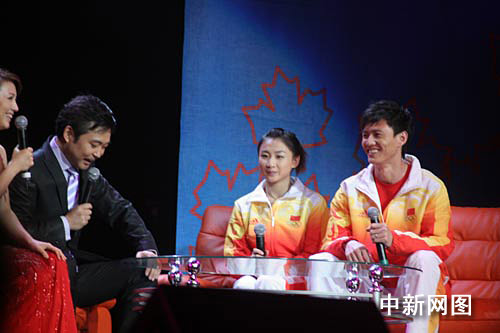 北京奧運(yùn)冠軍仲滿、何雯娜在演出現(xiàn)場與觀眾互動(dòng)。