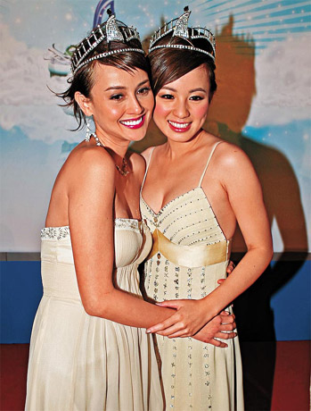 中新網(wǎng)12月8日電 前晚(6日)亞視舉行亞姐總決賽,大會(huì)邀請(qǐng)到85年至07年的部份歷屆亞姐撐場(chǎng),眾人身穿吊帶低胸現(xiàn)深溝,盡秀驕人身材。其中新婚陳煒?biāo)中匕肼叮咽莾膳傅氖讓脕喗愎谲娎柩嗌海簧淼托卮虬纾渖蟽r(jià)值1,200萬元的鉆飾,風(fēng)頭最勁,而朱慧珊也戴上近千萬首飾搶鏡。
