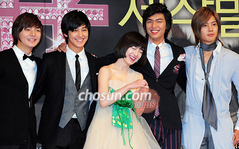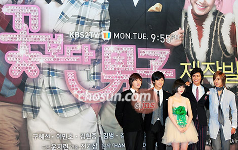 中新網(wǎng)12月22日電 朝鮮日報日文網(wǎng)消息,KBS2電視臺新周一、二電視劇《流星花園》制作發(fā)布會于22日下午2時在首爾小公洞樂天酒店水晶球廳舉行。男主角金俊、金范、金賢中和李珉浩及女主角具惠善皆出席了發(fā)布會。