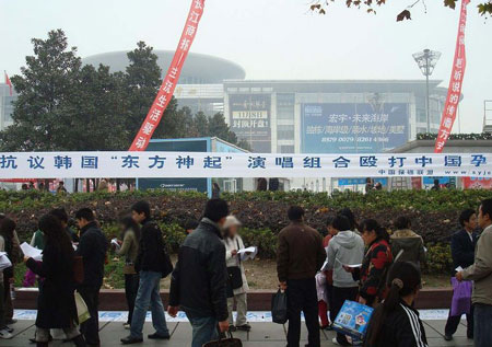 中新網12月26日電 近日,一篇題為《東方神起武漢演唱會前夕遭現場抵制》的帖子熱傳國內各大網站論壇,該帖一出即引發大量網友口水戰。文章說,2008年12月20日,來自武漢三鎮的志愿者在武漢會展中心地區,就“東方神起”針對中國女性的暴力行為發動簽名抗議,志愿者高舉“抗議韓國‘東方神起’演唱組合毆打中國孕婦”條幅,呼吁市民積極參與此次抵制活動。雖然到目前為止,整件“毆打孕婦”事情的真偽性還沒有一個官方的說法,但網友這種自發的行為還是吸引了大量的觀望著,甚至有眾多路人在條幅上簽名表示支持。