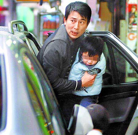 陳威陶(左)50天沒見到兒子,下車時他緊抱小蝦米、四處查看,似乎深怕小孩再被搶走。