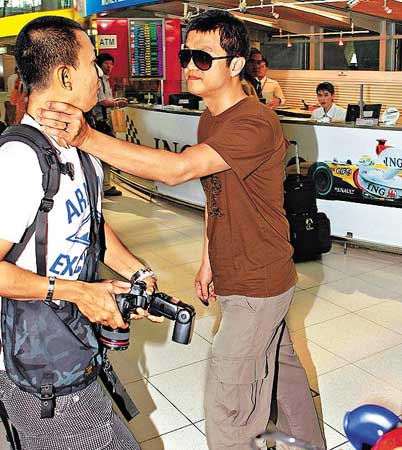 今年7月23日,李亞鵬與妻兒才參加完劉嘉玲、梁朝偉的婚禮,在曼谷機(jī)場就遭遇狗仔等候。見此情形,李亞鵬趕快護(hù)著家人離開,誰知遇見一個狗仔,對著李嫣就是一陣猛拍。眼看愛女被閃光燈閃得兩眼昏花,李亞鵬一個“獅吼”沖向狗仔,不但掐其咽喉,還用“無影腳”踹了那狗仔一腳。此時狗仔也來了幫兇,拿攝像機(jī)記錄了李亞鵬的“罪行”,并要挾李亞鵬。怒火攻心的李亞鵬也全然不顧形象,順手就扇了狗仔一耳光,并大呼:“你拍我也不怕,你拍我怕嗎?”