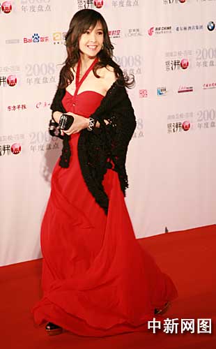 中新網2月19日電 2009年初嫁給倪震的女星周慧敏,今日在國家游泳中心水立方以一襲鮮紅的低胸紗裙配黑色披肩,亮相第二屆湖南衛視•百度娛樂沸點2008年度盤點典禮紅地毯。這是她婚后首次亮相內地公開活動。