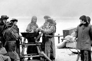 記者昨日在現(xiàn)場看到,每當(dāng)拍戲的間歇,演員們就三五成群地圍到行軍火盆旁邊烤火、聊天。還有的演員扭在一起摔跤,以運(yùn)動來增加熱量。