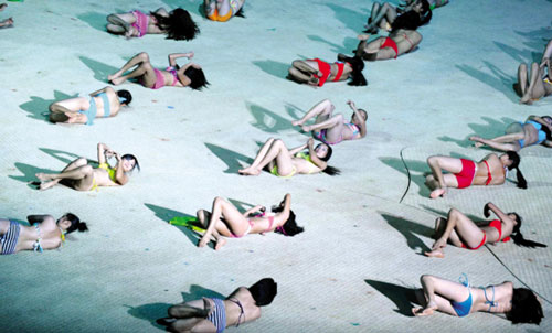 “印象沙灘”是整場演出中最“養(yǎng)眼”的一幕。剛開始,兩個穿著短裙的姑娘跑到舞臺中央,一陣狂舞之后,兩人突然豪放地當(dāng)著全場觀眾的面,脫下短裙,露出性感的三點式泳衣。觀眾還來不及驚呼,更多的三點式美女出現(xiàn)了,先是十幾個,后來是上百個……滿場都是!她們朝著觀眾席大喊:“我們是海南島的姑娘!我們很年輕!我們很漂亮!” ……