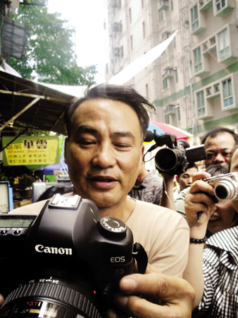 昨天的拍攝地點(diǎn)叫永利街。那是很窄的一條街道,其中一邊已經(jīng)改造成了高樓,另一邊則保留了一些舊樓。劇組在舊樓這邊搭了些鐵架和舊式廣告招牌,營(yíng)造上世紀(jì)60年代的氣氛。導(dǎo)演羅啟銳介紹:“這條街是香港最后一條60年代老街了,本來已經(jīng)要拆掉,但是政府為了關(guān)照我們,特意推遲到我們拍完再拆。我們用這條街來重現(xiàn)當(dāng)年的深水埗!备邩谴髲B的存在有時(shí)挺影響拍攝,“經(jīng)常穿幫,要靠后期特效來消除”。據(jù)說,導(dǎo)演小時(shí)候就住在這里。