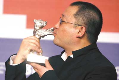 《左右》拿了銀熊獎,連導(dǎo)演王小帥都沒有想到。頒獎臺上,評委戴安·克魯格把銀熊遞到王小帥的手里。王小帥先是給了評委克魯格一個禮貌的擁抱,然后把銀熊舉到左邊與臉相平的位置,輕輕一吻。時間定格在這一刻,王全安在柏林、李安和賈樟柯在威尼斯,用的都是同一種姿勢親吻代表最高榮譽的獎杯。