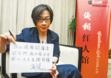 2009年兩大春晚紅人之一——?jiǎng)⒅t,來(lái)到錢(qián)報(bào)紅人館做客了。坐在本報(bào)記者面前的沙發(fā)上,遭遇到“近景魔術(shù)是否將如同選秀一樣走向死亡”這樣并不令人愉快的話題,劉謙連眉毛也不跳一下,依舊保持著他典型的職業(yè)化的笑容,胸有成竹地拆招:“就算選秀死了,不代表將來(lái)人們就不唱歌了,魔術(shù)同樣是不可缺少的。其實(shí),我根本不擔(dān)心這個(gè)問(wèn)題。”