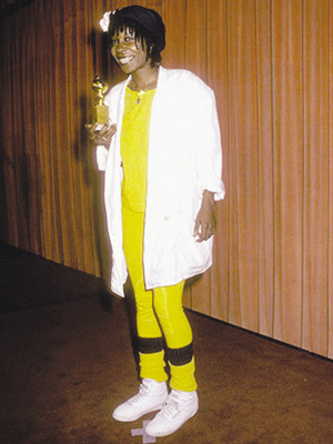 1986年,烏比·戈德堡憑《紫色》獲得最佳女主角獎。除了演技備受肯定之外,她的這身打扮也絕對讓人眼前一“亮”——一身亮黃色運動套裝、不合體的白色外套,一雙白色高幫運動鞋。