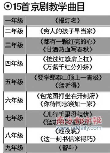 昨日廣東省教育廳體育衛生與藝術教育處副處長何志強告訴記者,他剛剛看到了教育部的文件。要求是每省選擇一個重點市開展試點,每省選20所學校,分別是10所小學和10所初中,在音樂課程中增加京劇曲目教學。教育部要求從2008年3月到2009年7月在北京、天津、黑龍江、上海、江蘇、浙江、江西、湖北、廣東、甘肅等10省市開展試點工作,并在試點的基礎上逐步在全國推開。