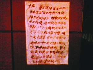 昨天上午,記者突然從某網(wǎng)站上發(fā)現(xiàn)了一個(gè)有關(guān)于丹來寧做講座的帖子,打開帖子一看,記者不禁嚇了一跳。原來發(fā)帖人周二晚上路過鳳凰國(guó)際書城時(shí),意外發(fā)現(xiàn)外墻上貼了一張匿名的小紙條。紙條上的留言挑釁意味明顯,甚至帶有一些恐嚇色彩。該發(fā)帖人于是用手機(jī)將紙條拍成照片,貼在了網(wǎng)上。