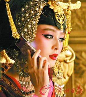 電影中的這場戲,是范冰冰扮演的大明星王菁菁在拍片現(xiàn)場與男友通電話,還穿著戲服直沖到舞會(huì)現(xiàn)場,古代與現(xiàn)代的反差制造出“穿越”的效果,極具喜劇感。劇組特別邀請(qǐng)到北京奧運(yùn)會(huì)開幕式的核心造型師陳敏正打造這個(gè)古裝造型。