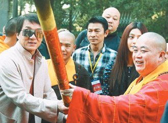 中新網(wǎng)10月23日電 劉德華將在新片《新少林寺》中拜成龍為師學(xué)功夫!昨天河南少林寺的寧靜被打破,宣揚(yáng)武術(shù)精神的《新少林寺》開鏡,成龍、劉德華、謝霆鋒、范冰冰、吳京齊聚少林寺,現(xiàn)場貴賓、武校學(xué)生見到巨星全變粉絲,拚命圍上前來,場面一度失控,成龍則發(fā)揮大哥本色指揮現(xiàn)場,呼吁大家維持秩序。