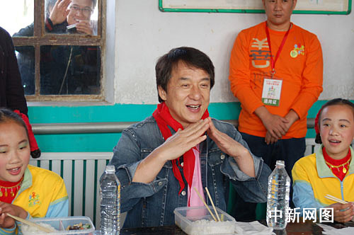 臨近午飯時(shí)分,成龍與十幾名小學(xué)童每人領(lǐng)到了一盒香菇炒油菜和白米飯的盒飯,在一間簡(jiǎn)陋的教室里津津有味地吃了起來(lái)。雖然是頭一次與國(guó)際巨星成龍?jiān)谝黄鸪燥垼蛇@些鄉(xiāng)村娃娃卻一點(diǎn)也不怯場(chǎng),好奇心驅(qū)使他們左一個(gè)問(wèn)題右一個(gè)問(wèn)題問(wèn)個(gè)不完。而成龍卻面帶笑容地邊吃邊聊,將他的成長(zhǎng)經(jīng)歷和成功經(jīng)驗(yàn)?zāi)托牡匾灰唤獯稹1妼W(xué)童聽(tīng)完后,紛紛夸“成龍叔叔好棒啊!”