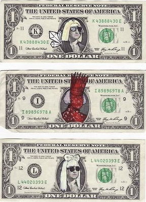 據外國媒體報道,美國流行音樂歌手、個性“舞后”lady gaga,如今可謂是紅得發紫,而她的影響力有多大?日前,美國一畫家,就將印有美國第1任總統喬治·華盛頓頭像的1美元鈔票,篡改成lady gaga的經典造型。lady gaga享受到了一回和美國總統平起平坐的待遇。