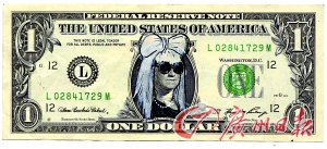 Lady gaga可謂紅得發紫,日前,美國畫家克里斯·格里森將印有美國第1任總統喬治·華盛頓頭像的1美元鈔票,篡改成Lady gaga的經典造型。