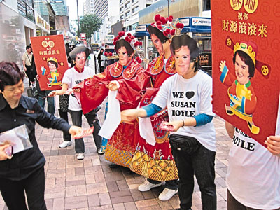 至于香港的蘇珊大媽粉絲也不甘示弱,近日戴起面具兼穿上“愛珊Tee”向途人大派“蘇珊財神”,代偶像祝港人今年財源滾滾。有關方面也推出了賀年新春限量版CD應節,附送蘇珊“心想事成”紅包10個,以配合唱片主題“我有個夢想”。