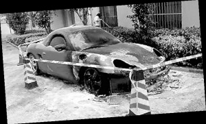 2010年2月26日凌晨,這輛跑車在南寧市錦繡江南小區內蹊蹺起火。