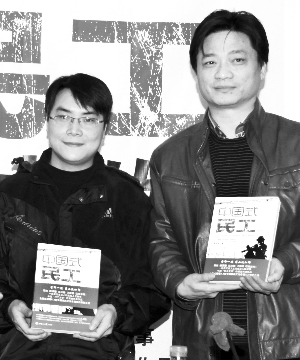 “周述恒指望《中國式民工》的稿酬回家蓋樓,主要就是看沈先生了”。央視著名主持人崔永元邊說邊把話筒遞給了外交部前新聞發(fā)言人、世界知識出版社總編輯沈國放。沈國放說,“希望大家都來關注這本書,關注農民工。”4月6日下午,四川籍民工周述恒的《中國式民工》一書的首發(fā)式在王府井書店舉行。